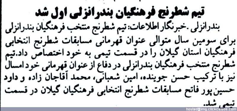 من به همراه حسن جوینده امین شعبانی وداوود حسین پور سالها به عنوان عضو تیم منتخب شطرنج فرهنگیان انزلی بود یم بارها قهرمان شطرنج تیمی فرهنگیان گسلان شدیم از جمله آخرین بار که مسابقات شطرنج در بهمن ۸۹ دررشت برگزار شد ازمیان ۲۰ شهرستان شرکت کننده باز هم تیم شطرنج بندر انزلی به مقام قهرمانی رسید